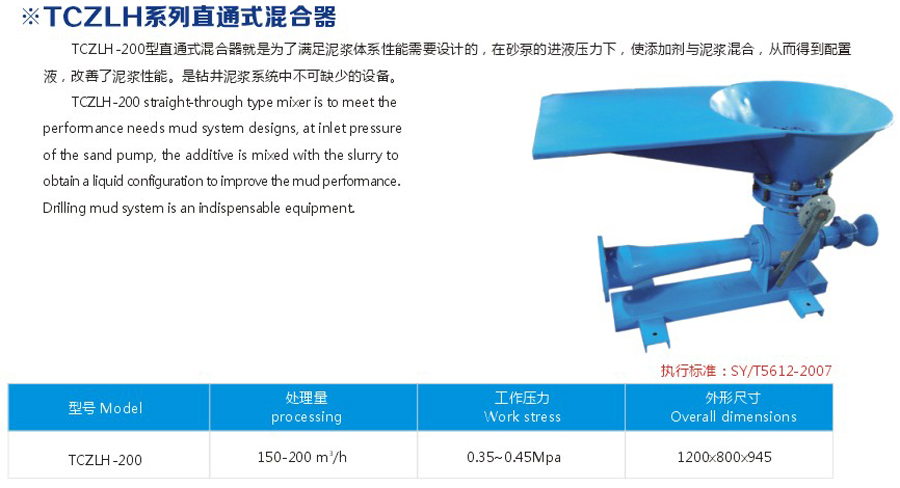 直通式混合器在鉆井過程中有時(shí)為了改變泥漿的性能,需要向泥漿中加入重晶石等固相添加劑。HD-200型直通式混合器就是為了滿足泥漿體系性能變化的需要設(shè)計(jì)的,它能使固相添加劑在進(jìn)入泥漿循環(huán)系統(tǒng)之前與泥漿均勻混合,解決了混合漏斗固相添加劑與泥漿混合不勻的問題,改善了泥漿使用性能,提高了鉆井質(zhì)量,是泥漿固控系統(tǒng)中不可缺少的設(shè)備之一。